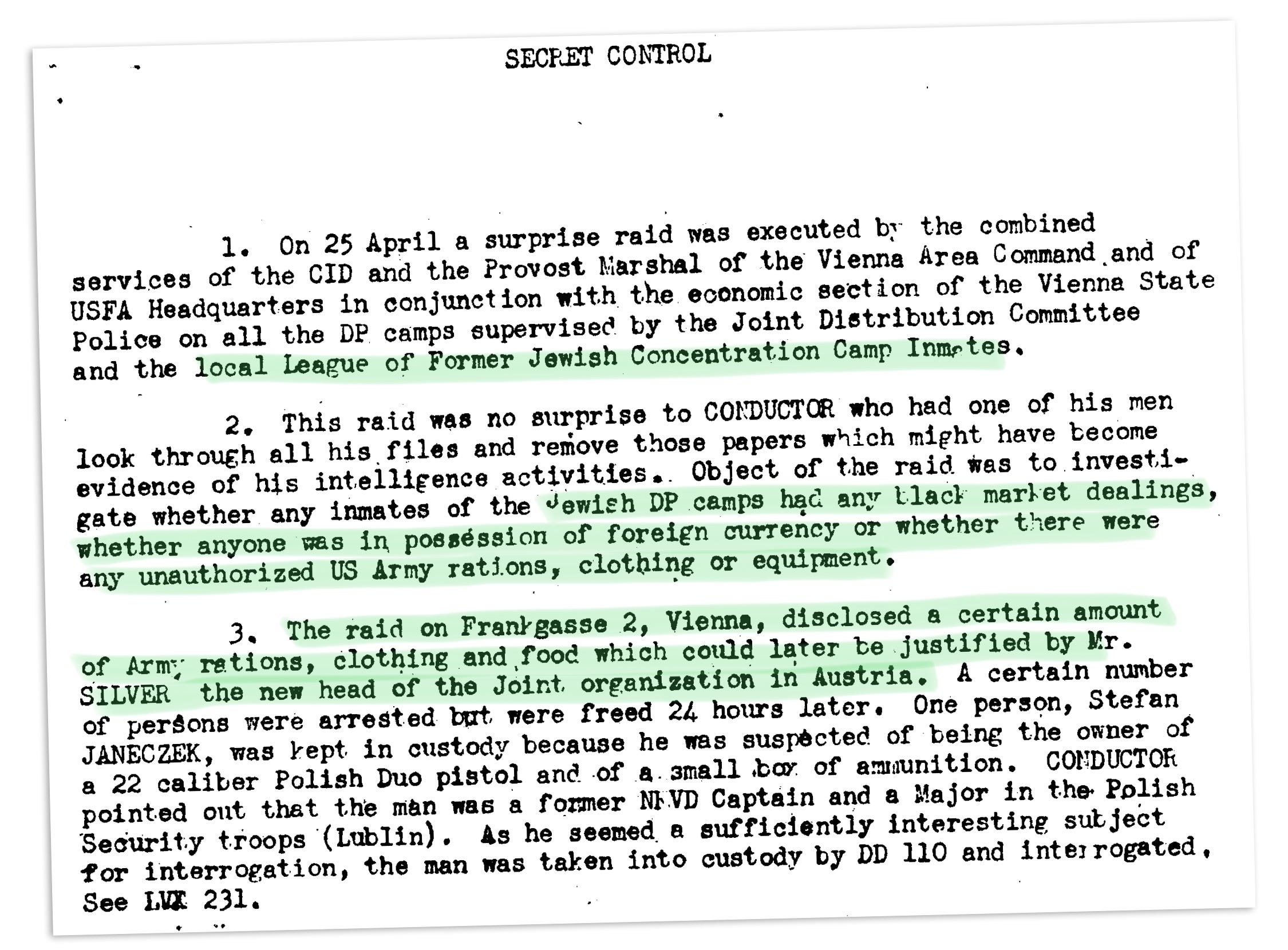 The report described a raid conducted by the US Army and the Austrian police on Jewish displaced persons camps that housed survivors of the Holocaust. The objective: to search for black market goods and to smoke out Soviet agents.