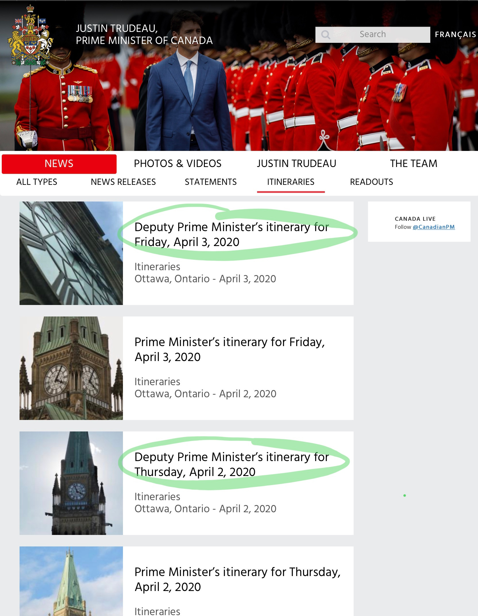 Now Chrystia — who has been leading Canada’s COVID-19 response — is the de facto leader of the country. Judging by the itinerary, she helping lead Canada while Prime Minister Justin Trudeau is under quarantine. (Thanks to my friend Dan Boeckner for the tip!)