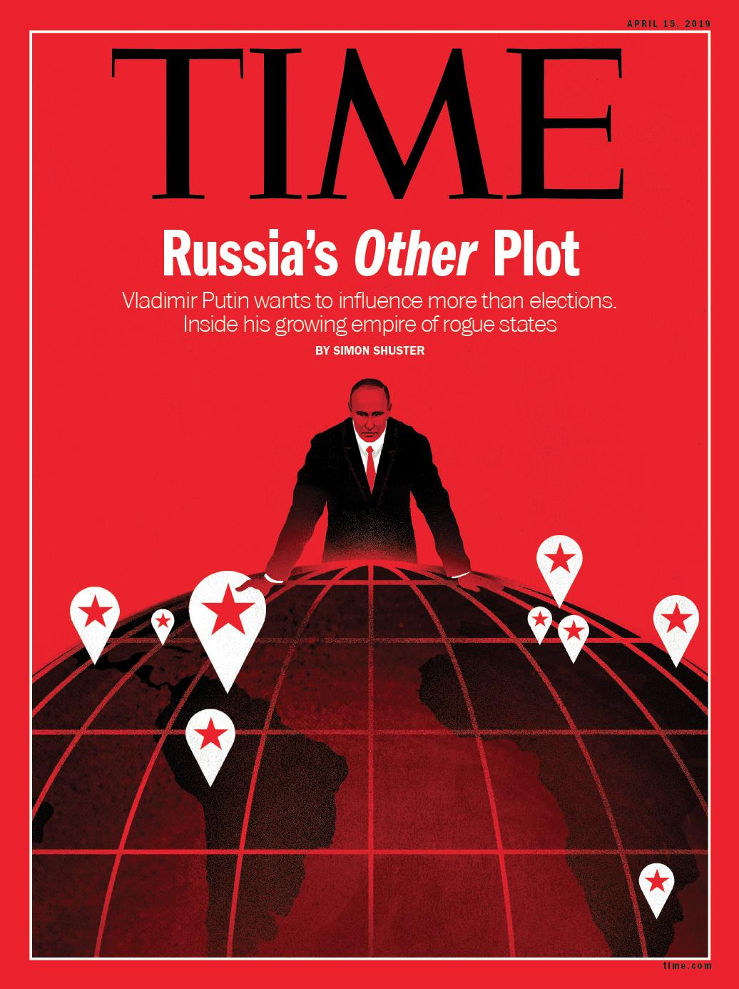 The particular other plot it references isn’t actually a plot at all, but a dramatic, hyped up description of Russia’s rather bland foreign policy, which aims at making and maintaining alliances wherever possible — from Venezuela to Syria to Sudan. It’s the kind of boilerplate threat-inflated reporting you’d find in a Reuters or AP wire dispatch. The article is unremarkable. What stands out, though, is Time magazine’s unapologetically xenophobic imagery.
