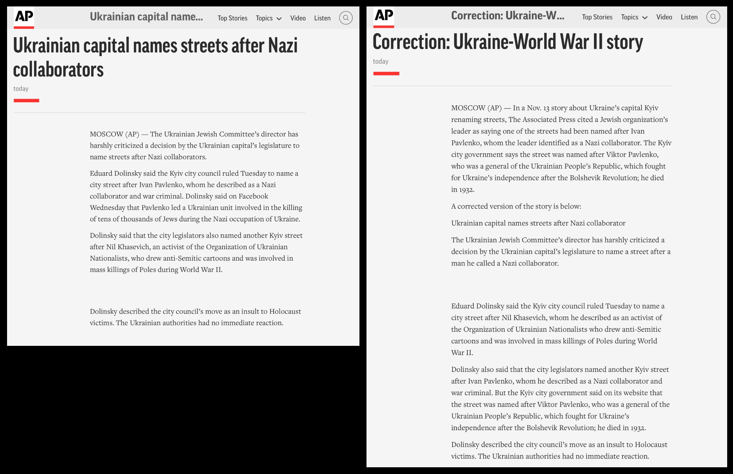 Then, yesterday, AP updated its dispatch: turns out that Kiev is honoring only one Nazi collaborator, not two. What an improvement!