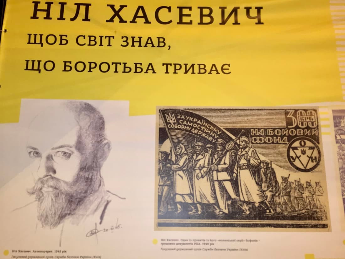 Nil Khasevych was (and is) hands down the most famous and celebrated propagandist for the OUN/UPA. His iconic blocky woodcuts and posters are still circulated and used by Ukrainian nationalists and far-rightists today. So it wasn’t a surprise that a big part of that exhibit was dedicated to celebrating his agitprop — especially his post-WWII work, which tended to show the OUN/UPA in a positive light, heroic light. In his rendering, these were not antisemitic maniacs bent on racial purity but freedom fighters who wanted to liberate all the peoples of the Soviet Union from totalitarian oppression.