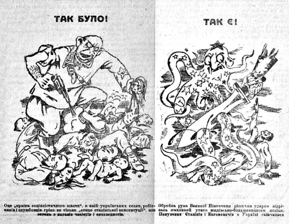 But aside from running feel-good propaganda for the OUN/UPA, Khasevych has other darker Nazi skeletons in his closet. For instance: During the first few years of the Nazi occupation, from 1941 to 1943, he lived in the Western Ukrainian city of Rivne, not that far from the village where he was born. There, he seems to have led the charmed life of a high-level collaborator. He served as a local judge and put his artistic skills to work pumping out antisemitic propaganda in various Nazi-controlled newspapers. According to Eduard Dolinsky, among other things, Khasevych published racist caricatures and agitprop that helped whip up campaigns of mass murder against the local Jewish population.