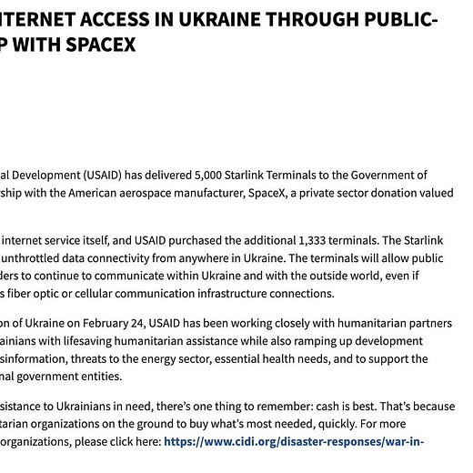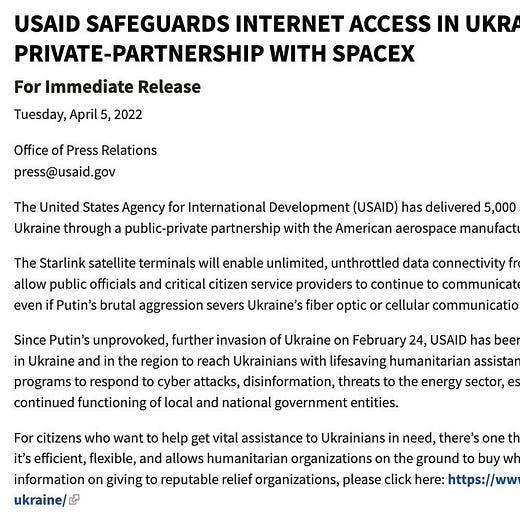 Doing a bit more digging, I realized USAID wasn’t a minor partner — but a seemingly major one, not only buying a bunch of Starlink dishes but arranging and funding the transport costs to get those things into a war zone. Yep, looks like Musk’s altruistic gift to help the people of Ukraine was in part funded by a U.S. government agency…an agency with a history of fronting for various covert soft power operations, including meddling in Ukraine. There’s USAID’s “Cuban Twitter” project. Remember that?