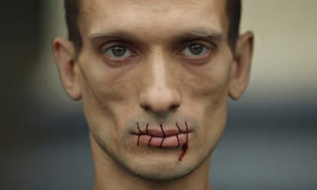 This isn’t the only way. Petr Pavlensky, another famous political performance artist from Russia, offers a counter-example. You might remember him as the guy who stapled his balls to the Red Square, sewed his lips shut, cut off his ear, and wrapped himself in barbed wire…