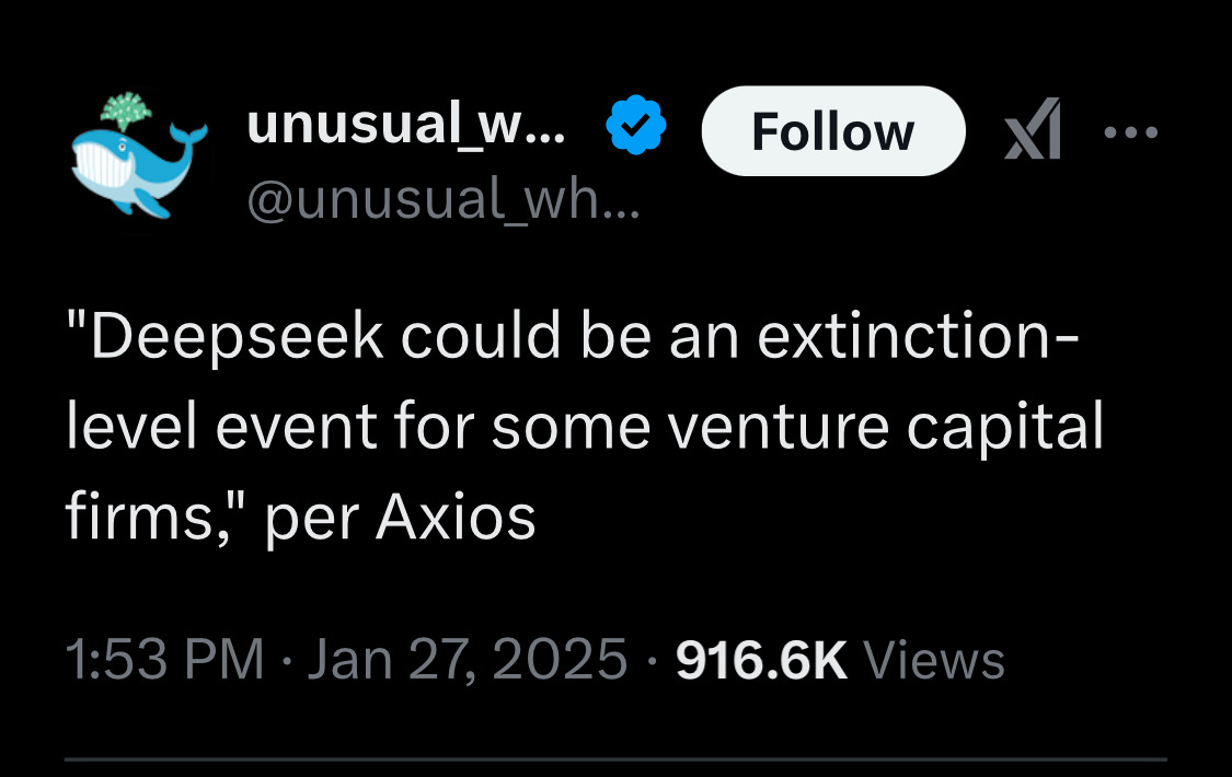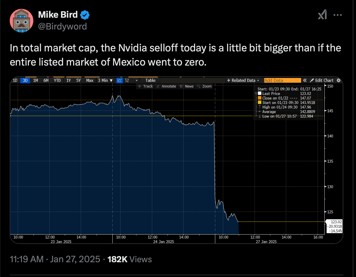 This is what everyone is freaked out about at this very moment: that American AIs might not be the most cutting edge has caused stock market casino investors to flee NVIDIA, the chipmaker staking its future on AI computing