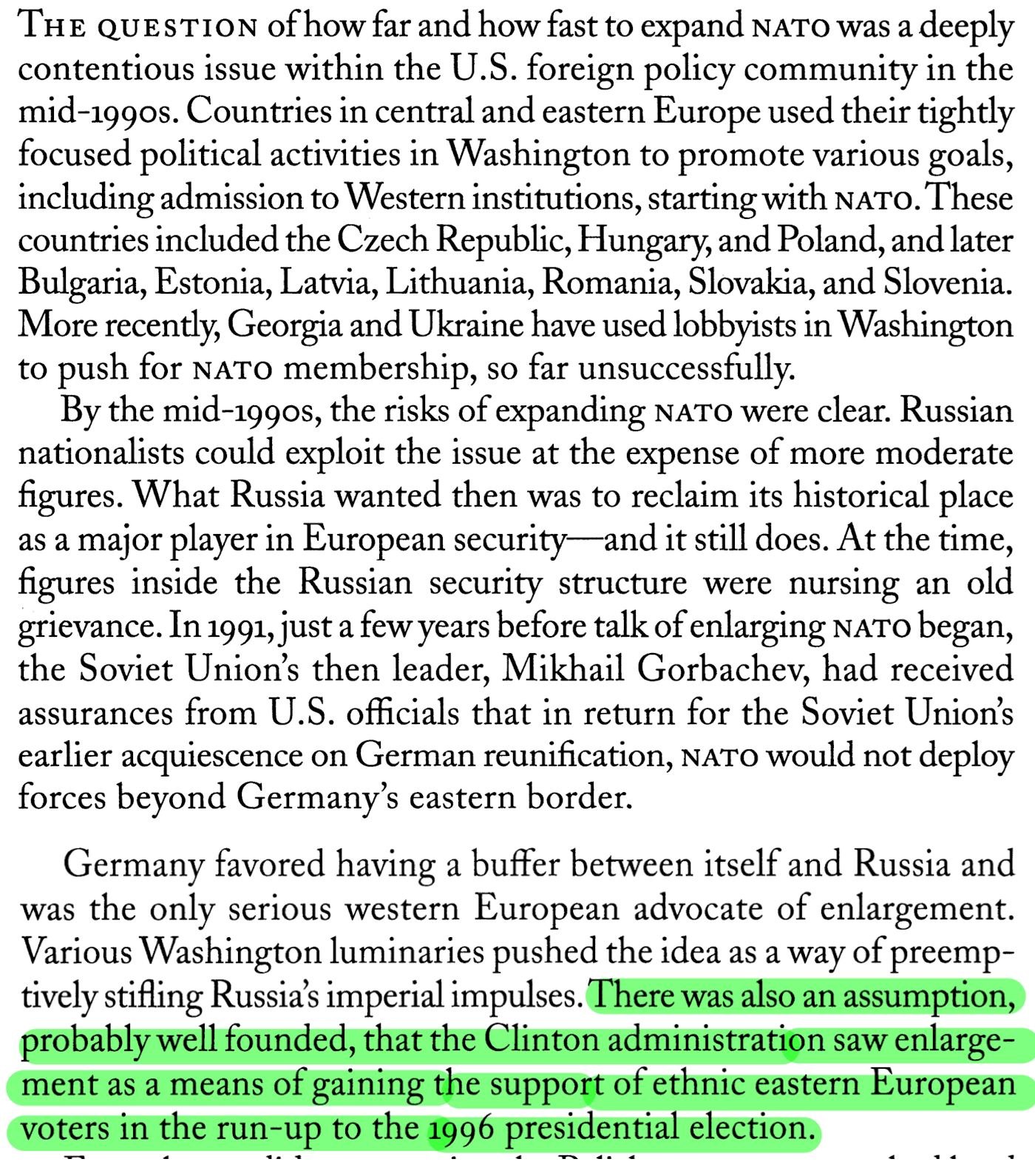 In fact, as a 2009 article in Foreign Affairs pointed out, it was widely assumed in political circles at the time that Bill Clinton was pushing for NATO enlargement at least in part as an election year issue: “the Clinton administration saw enlargement as a means of gaining support of ethnic eastern European voters in the run-up to the 1996 presidential election.”