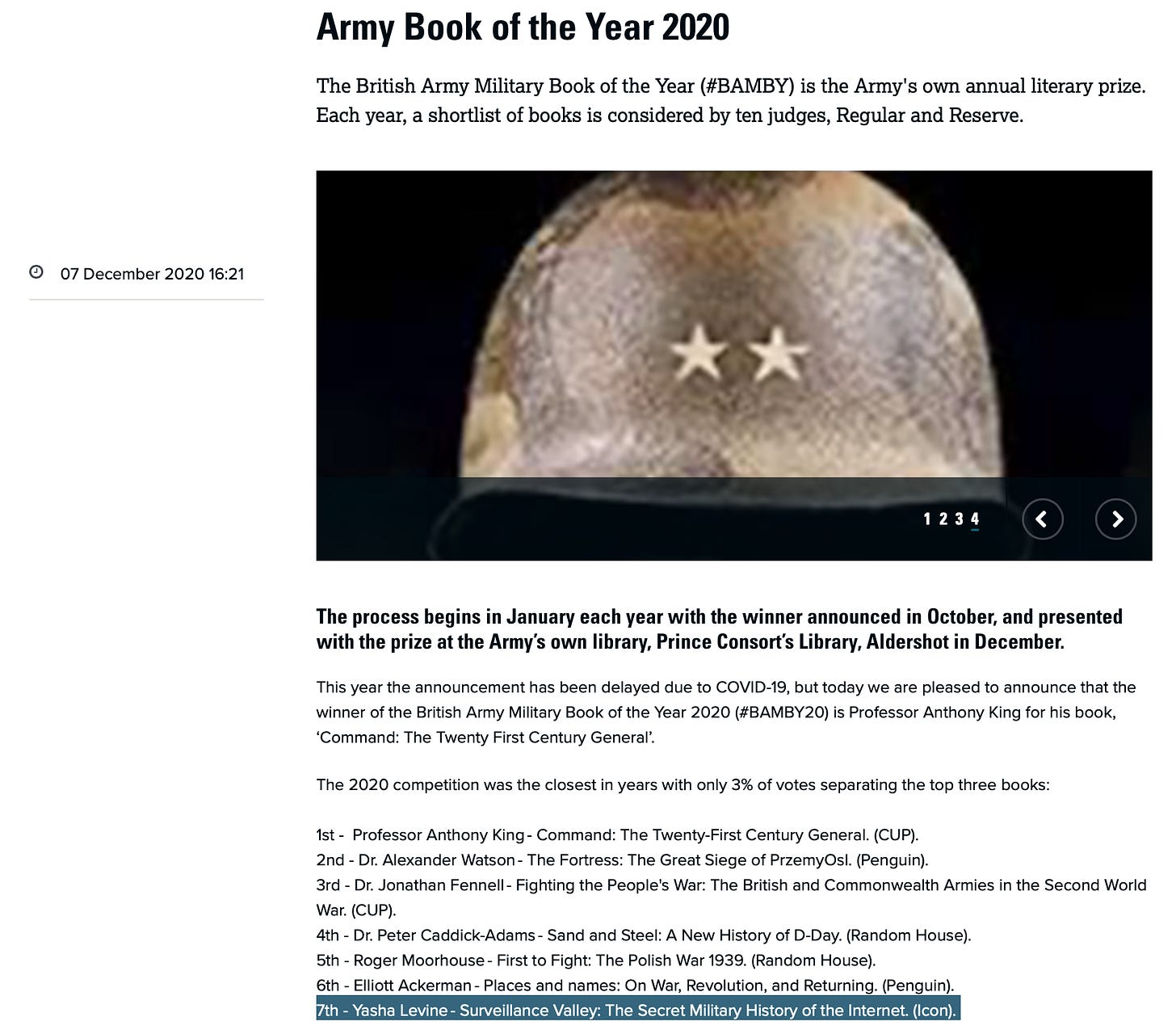 Last February, I found out that my book Surveillance Valley was shortlisted for “British Army Military Book of the Year.” The results are finally in, and…I’m dead last on the list.