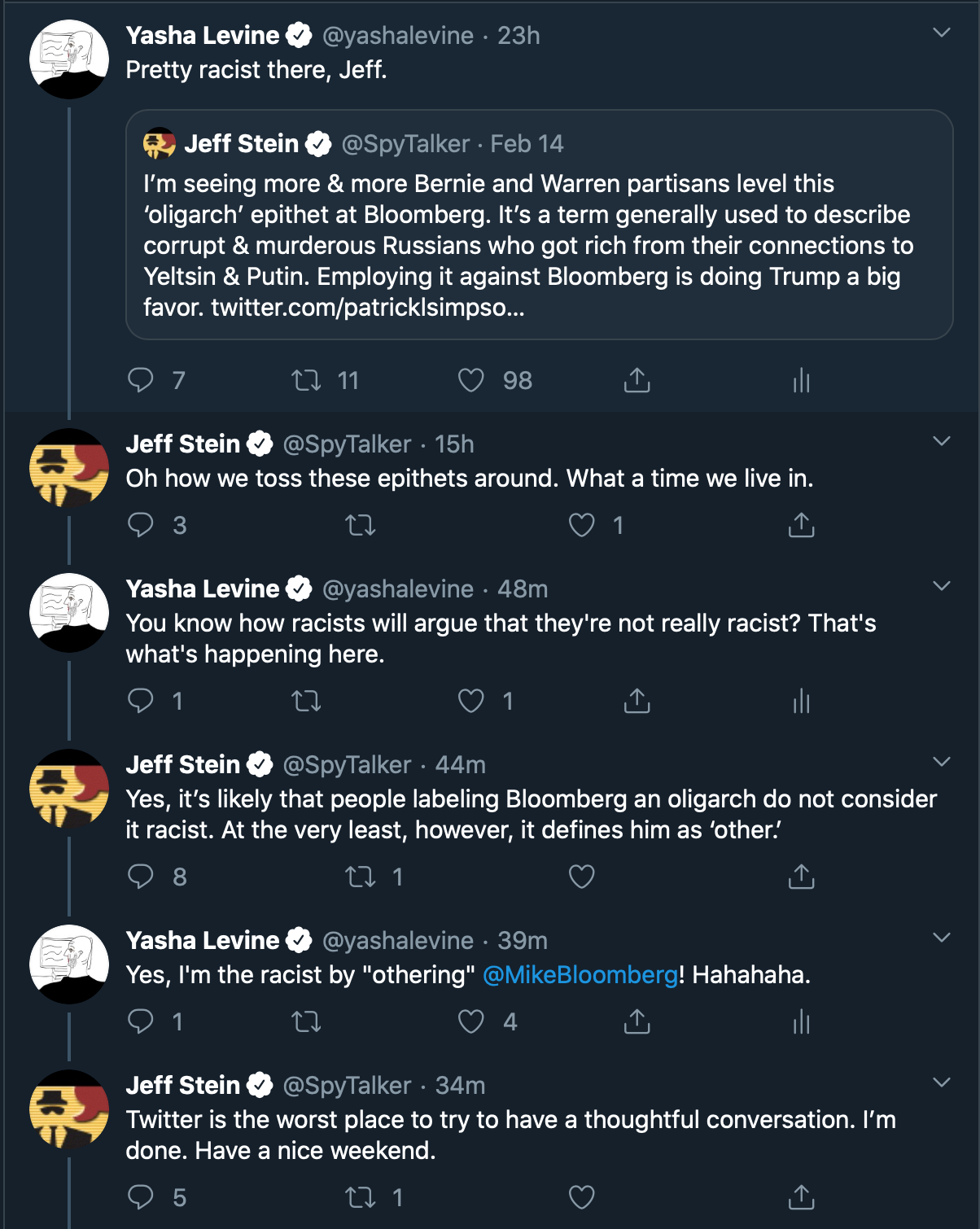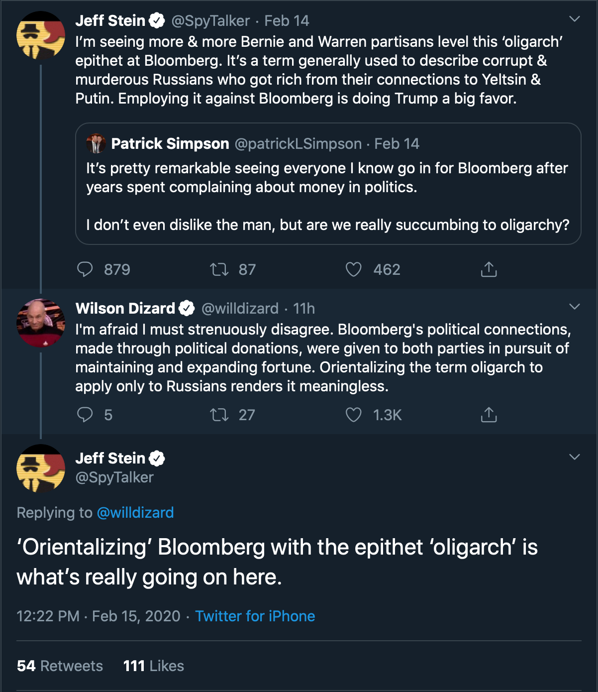 He berated some random guy for using the oligarch “epithet,” explained that the term only applies to “corrupt & murderous Russians,” and then went on the offensive, accusing people who insisted on calling Michael Bloomberg an oligarch of being racist. To Jeff, they were “orientalizing” the successful self-made businessman with an asiatic slur!