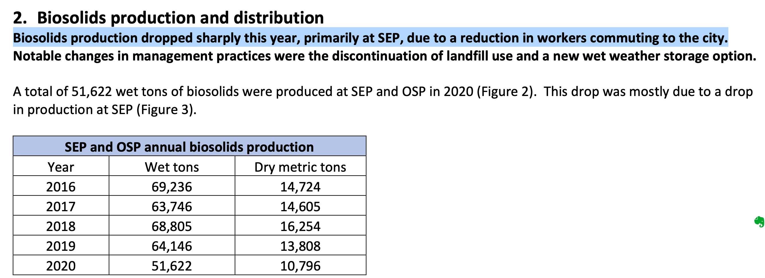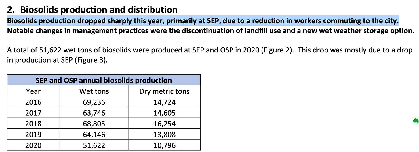 Why? The pandemic. No one came to San Francisco for a year — all the commuting office workers and the hordes of tourists that usually swarm the city stayed put and emptied their bowels at home. And that meant San Francisco’s had to work less hard to process and compact this out-of-town shit into sludge — or “biosolids,” as the waste management industry likes to call it. I bet all major cities have had a similar reduction in sewage volume, while suburbs and smaller cities have major boost. It isn’t just that people have been staying put in their homes, their shit has been staying put with them!