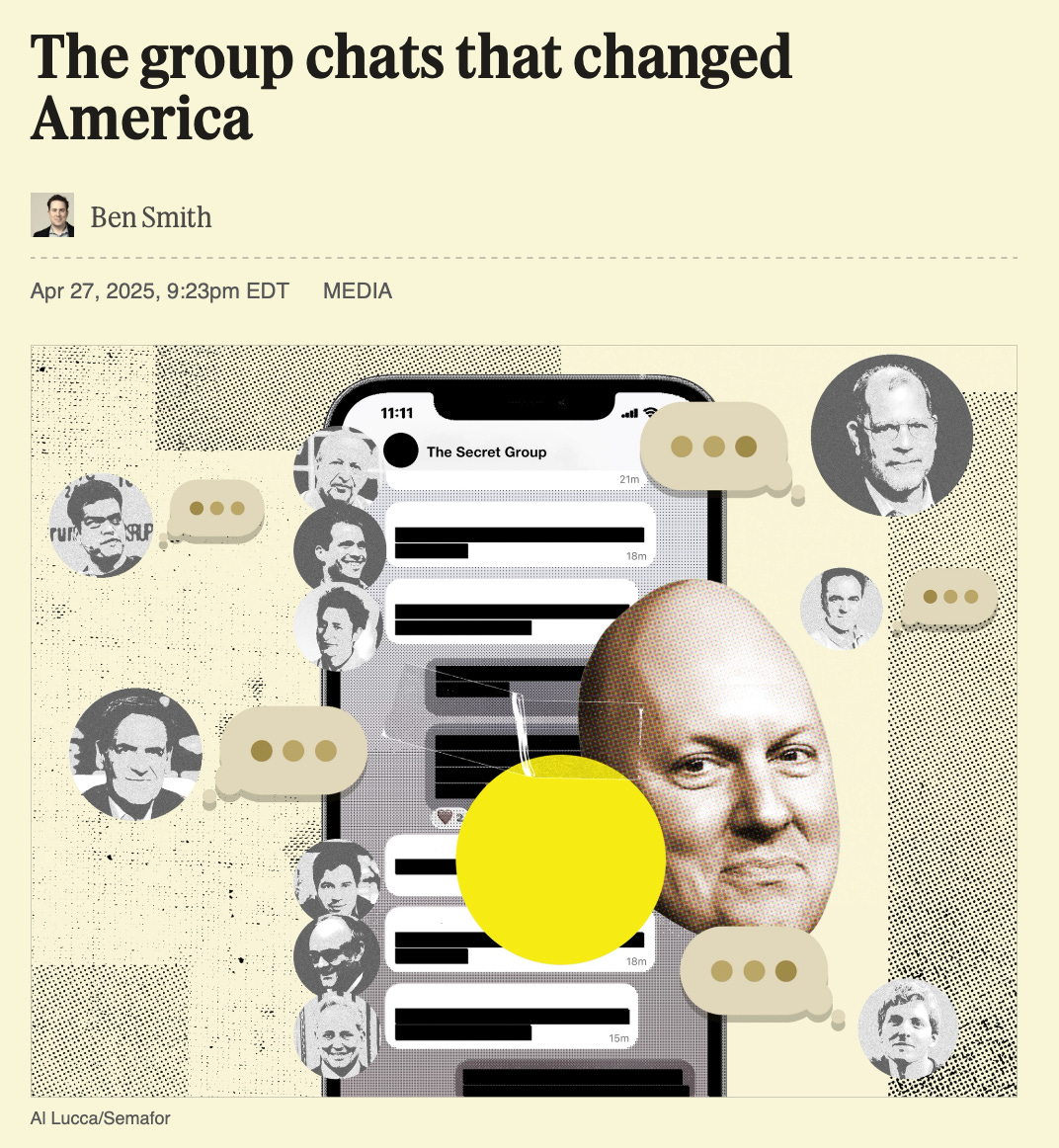 There’s a story by Ben Smith that helped crystallize my thinking on this. He gets into how a bunch of reactionary VCs and their parasitical buddies in the media and political class have been chatting it up on Signal, using it to plot the downfall of what’s left of limping, half-dead New Deal America. This Signal conspiracy started during the pandemic and then continued to grow, getting behind Trump in a major way and coordinating the VCs’ takeover of American politics, media, and culture…bringing in the Age of MAGA.
