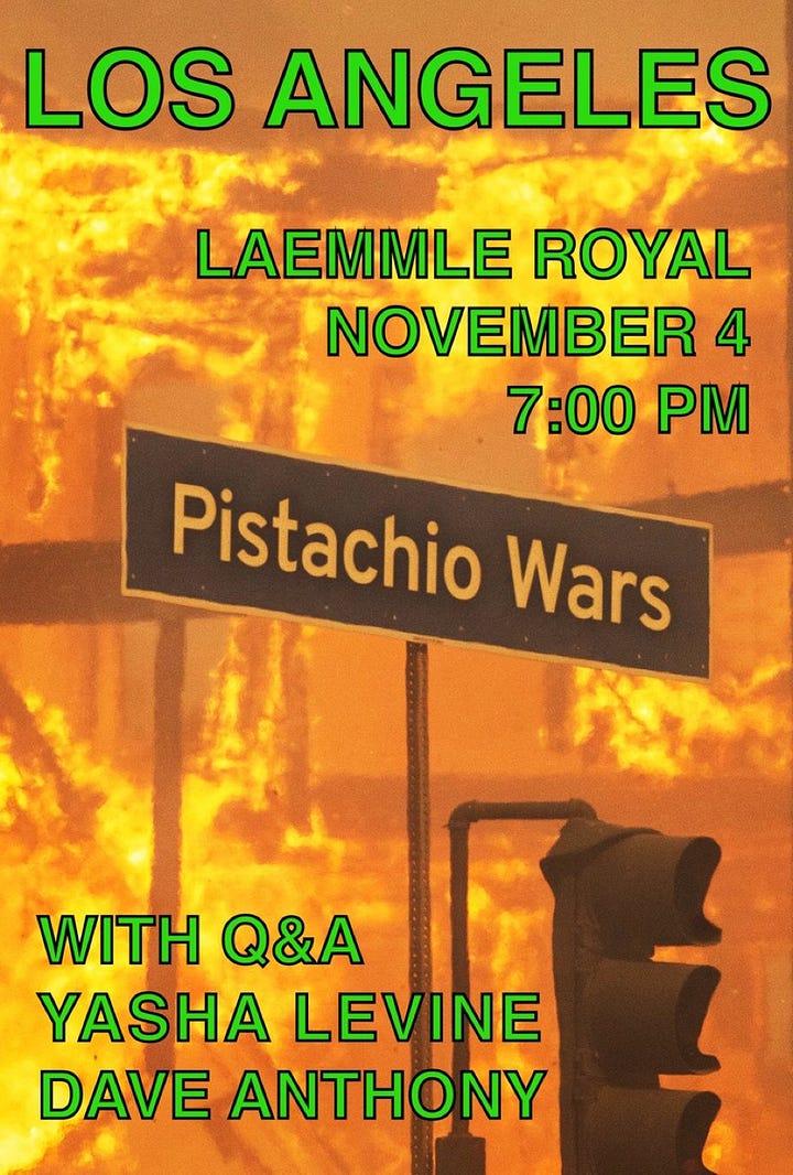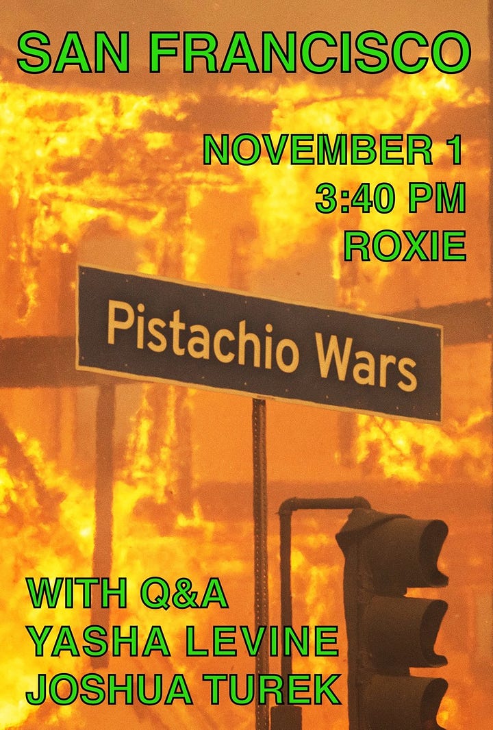 Hey, just want to update you on our now-expanded bicoastal elite PISTACHIO WARS screenings. We just added an Oakland show on top of the ones we’re having in San Francisco, Los Angeles, and New York. All of them will feature Q&As after the film moderated by the best and the brightest these metropolitan areas have to offer — Will Menaker, Joshua Turek, Dave Anthony, my friend Dan Raile…