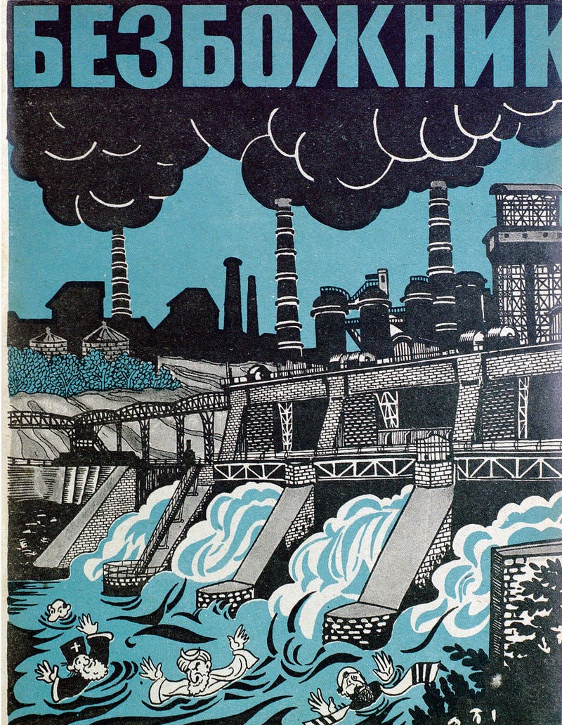 The cover shows a priest, a mullah, a rabbi, and what is I think is probably an evangelist preacher being flushed down a river. And who is doing the flushing? A denuded landscape with a hydroelectric dam and a bunch of belching factories! The symbolism couldn’t be clearer. The new is flushing out the old. Get out, you reactionary holy men. There’s a new God in town: Industrialization. Pollution is the new spirit and factories are the new places of worship — hence the title of the magazine: The Godless Factory Worker.