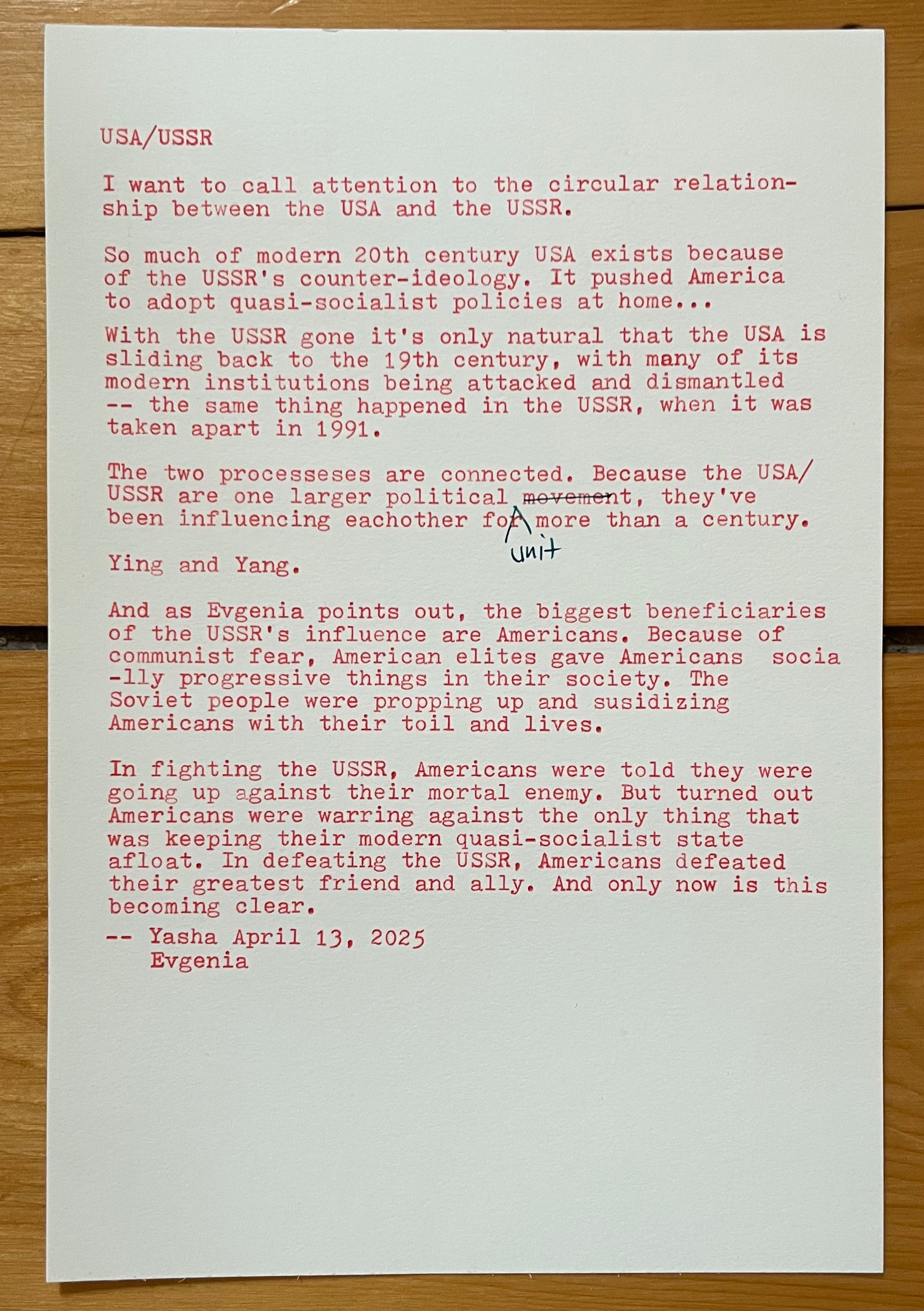 Evgenia and I were talking a bit and I was taking some notes for our event tonight in NYC and I ended up typing up a very basic outline of something we’ve been thinking about lately — the connection between the USA and the USSR.