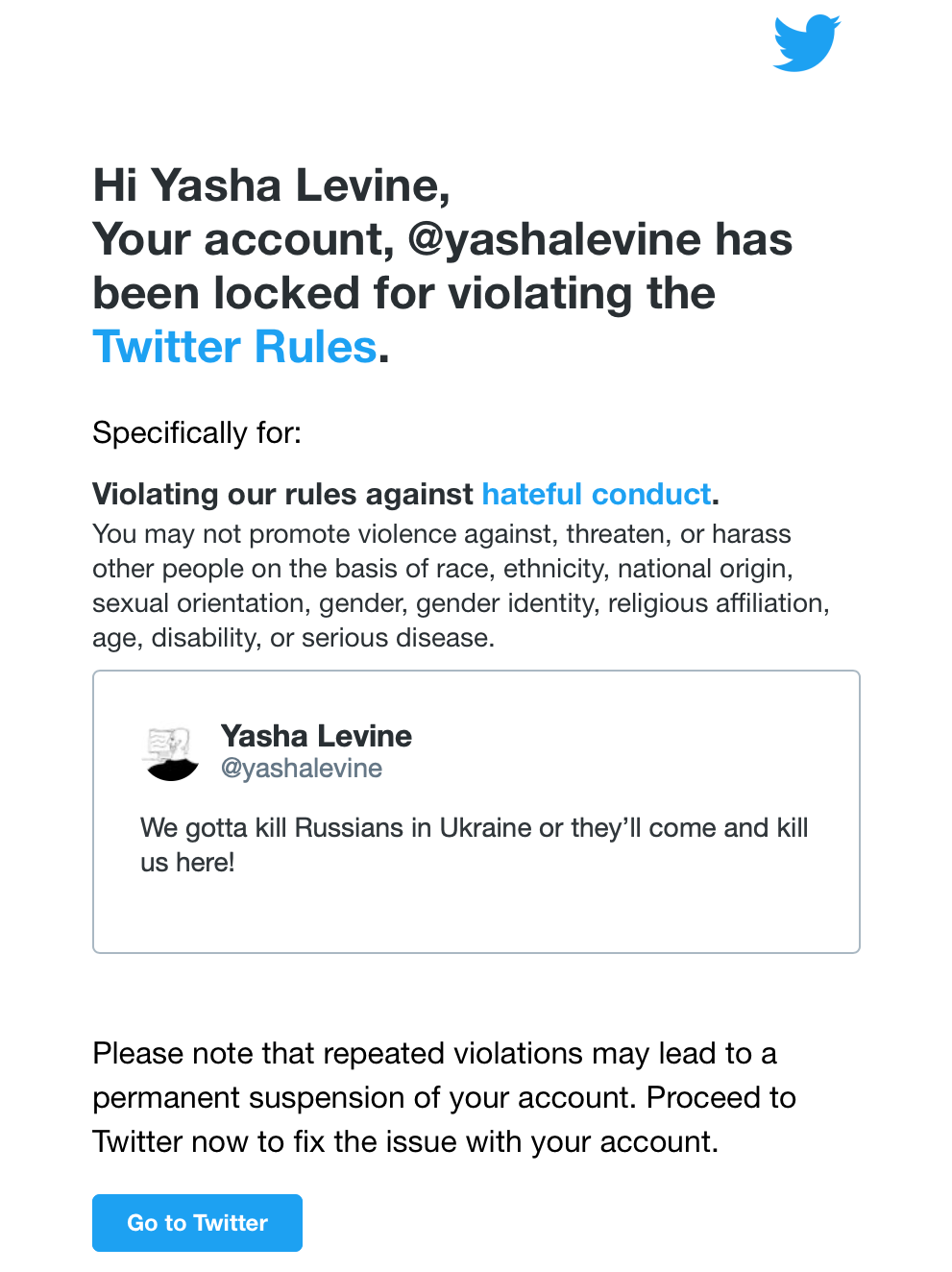 Mark Ames sent a complaint to Twitter on my behalf and pointed out how insane it is: