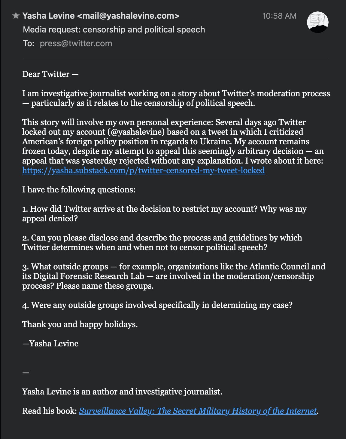 I want to restore access to my account, which is still locked. But I would also like the company to disclose how it goes about making these decisions — and if any outside corrupt, pay-to-play political lobbies and groups like the Atlantic Council are involved in the process, as they are with Facebook.