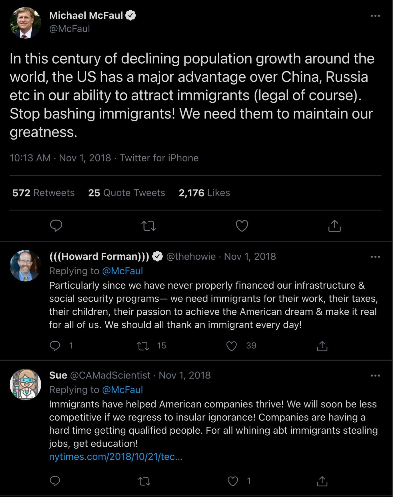 He typed the tweet out in November 2018 in response to one of Donald Trump’s anti-immigrant outbursts that was roiling the news cycle at the time. As you can see, McFaul thinks he’s being progressive and tolerant and supportive of immigrants. He thinks he’s being the polar opposite of Trump — that he’s standing up to Trump’s bigotry and xenophobia. And yet he’s voicing a liberal inversion of the same kind of America First thinking.