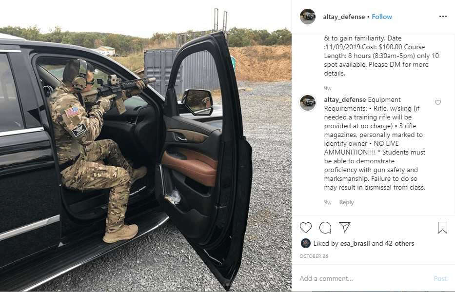 …Altay Defense receives instruction from James Lang, a former US Army Ranger who served in Afghanistan and Iraq and works as a firearm instructor for the US Department of Defense. Lang also operates Ridgeline Security Consultants, which provides firearms and tactical training to “prepare law enforcement officers [and] armed security professionals […] to survive and win deadly force confrontations.”