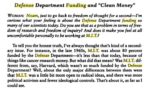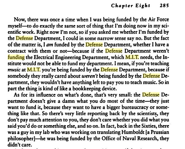 I mean, look at how he described his Pentagon funding during a talk he gave: The military guys were idiots who had no idea what you were doing. In fact, he claimed that the more military money a university got, the more radical it was!