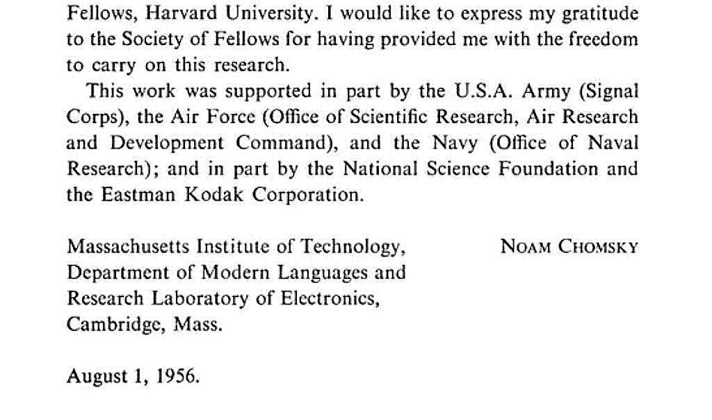 He rose to fame by redefining the study of linguistics, and helped spark the “cognitive revolution” by positing that human language was produced by what was essentially a specialized language computer module in the human brain—like a sound card plugged into a mother board. He theorized that language could be boiled down to logical expressions, which was the foundation of computer language. His linguistic work at MIT in the 1950s was funded by the army, navy, and air force in large part because the military wanted to develop computer technology that could process human language on the fly in order to analyze intelligence intercepts, to process press reports, and to understand human commands.