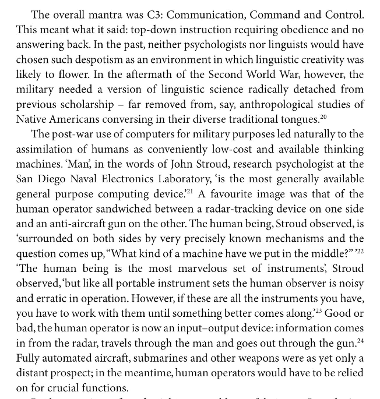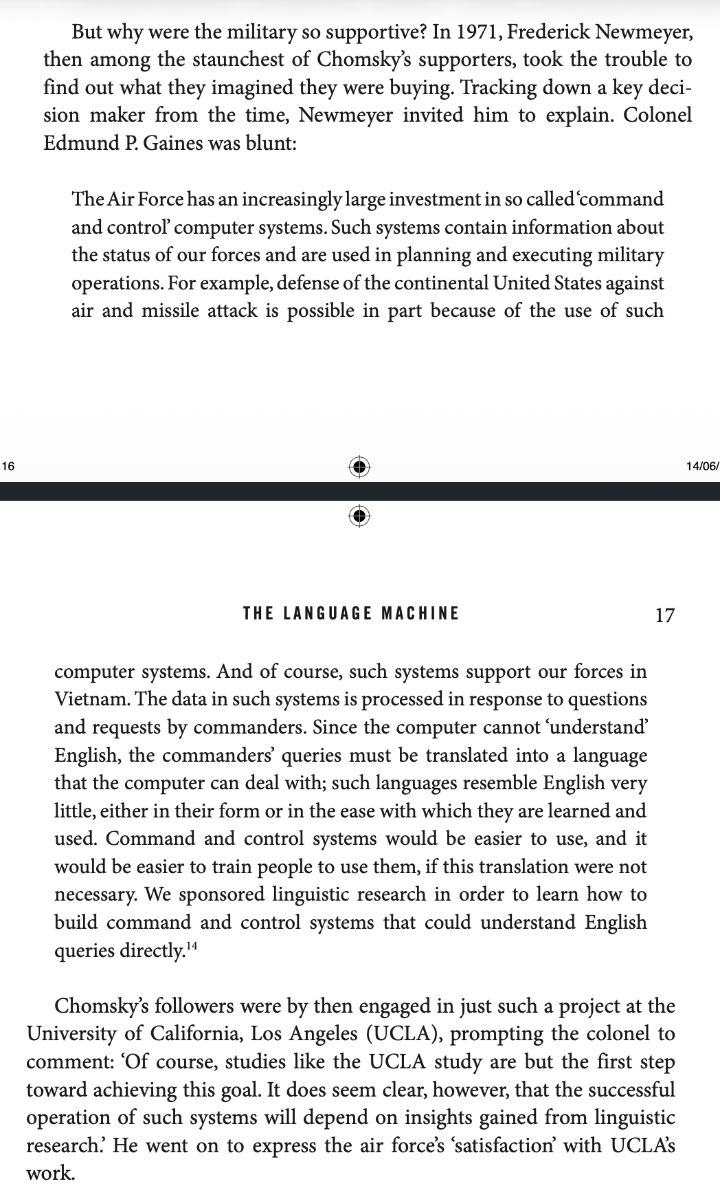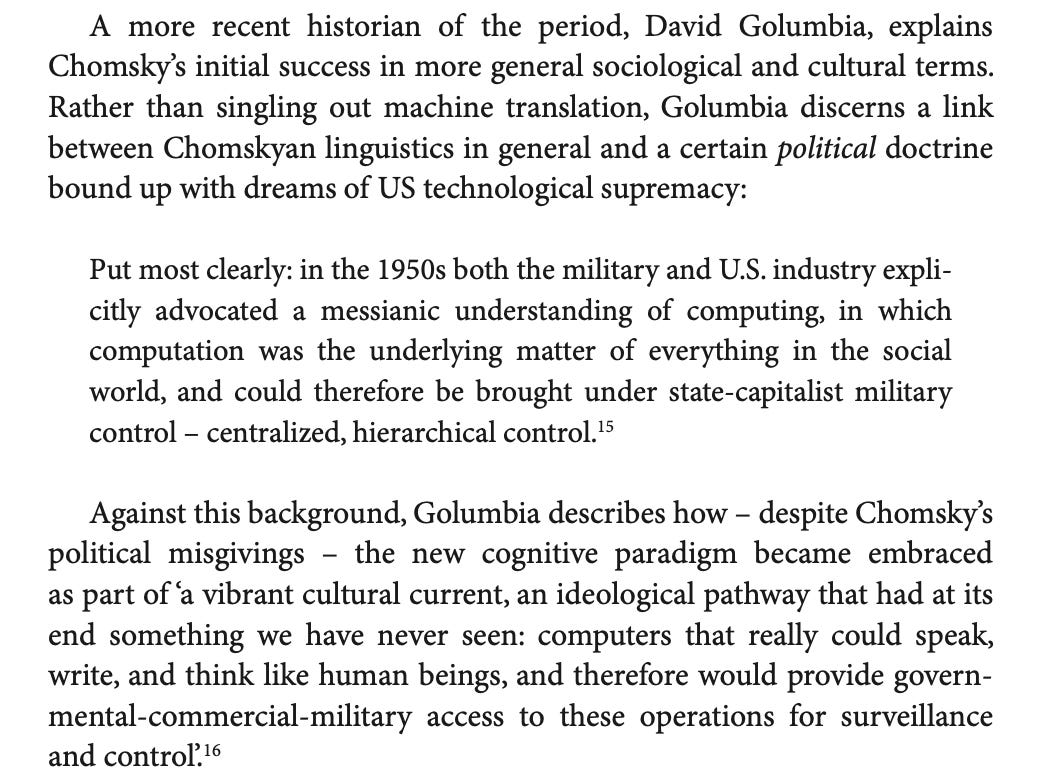 I studied Cognitive Science at UC Berkeley. And I took a linguistics class — a class basically teaching Chomsky’s theories as gospel. And I very clearly remember sitting in a café doing these algorithmic-type universal grammar sentence analyses for my homework and being very confused by the nonsensical uselessness of it. You deconstruct a sentence to the point that it has no meaning. And so what? Only later did I realize that there was a reason why it felt like this approach to studying human language was made for computers: it was. Chomsky helped trigger the cognitive revolution in psychology — a “revolution” that posited the best way to understand the human mind is to think of it as a digital computer…a development that was essentially funded by the Pentagon because it aligned with its larger drive to turn the world into a giant surveillance machine. I only realized this later, when I was writing my book.